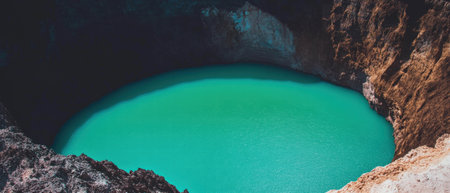 Close up of turquoise volcanic water reveals vibrant mineral colors and rugged crater edges in the mysterious Kelimutu crater lakes