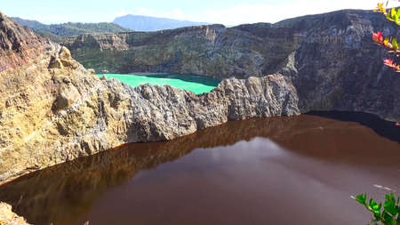 Adjacent green and red/brown volcanic lake at Kelimutu National Park, Indonesia.