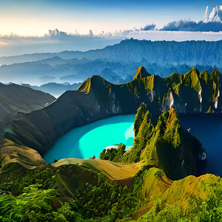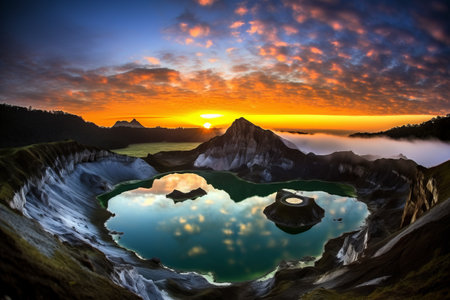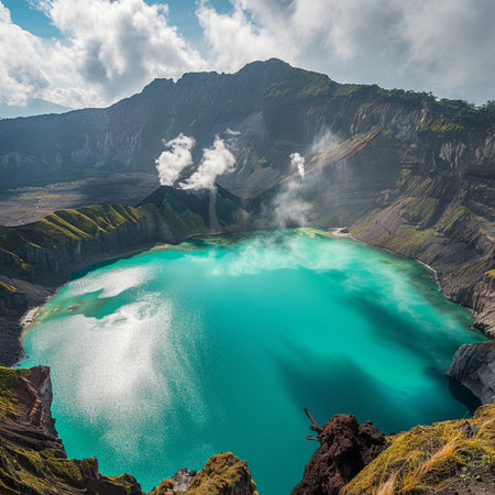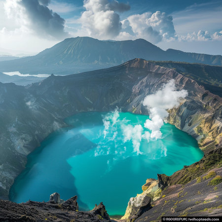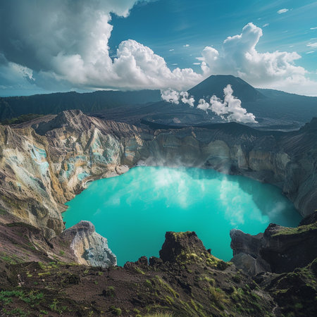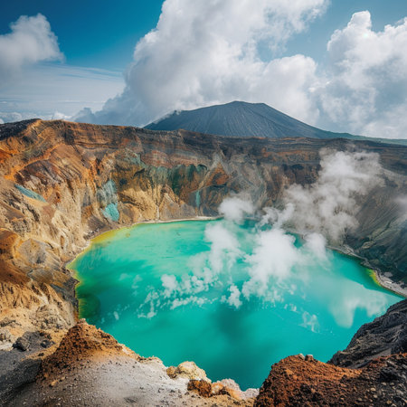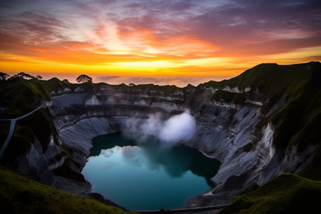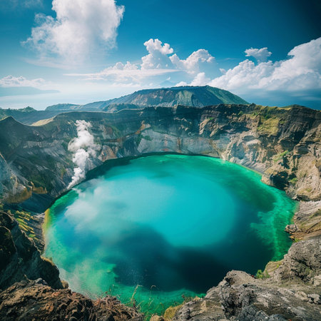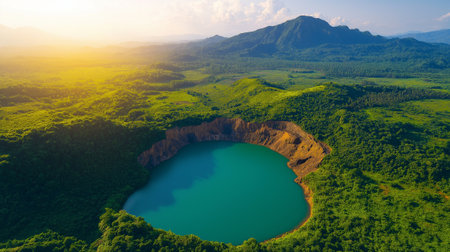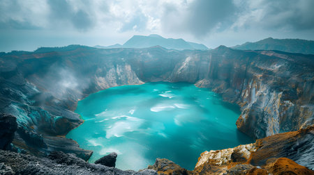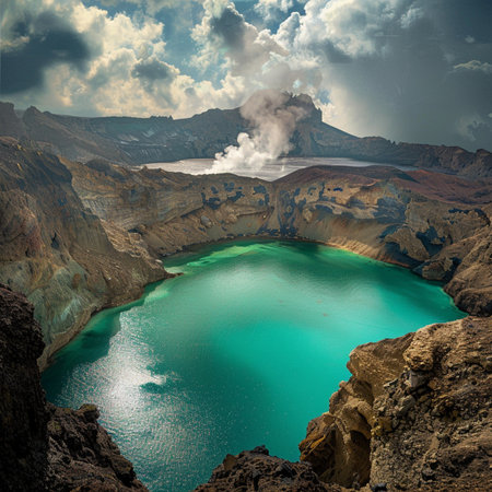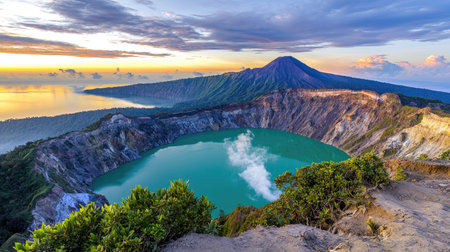 Breathtaking view of a vibrant crater lake nestled within a volcanic landscape, showcasing dramatic colors as sunlight casts warmth over serene waters.
