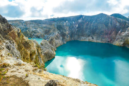 Close up view on the Kelimutu volcanic crater lakes in Flores Indonesia. Lakes are shining with many shades of turquoise and blue. Sun shines through clouds. Barren and sharp slopes of volcanic crater