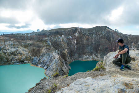 Man sitting at the volcano rim and watching the Kelimutu volcanic crater lakes in Moni, Flores, Indonesia. Man is relaxed and calm, enjoying the view on turquoise lakes. Lakes have different colours