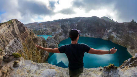 Man standing at the volcano rim with arms spread and watching the Kelimutu volcanic crater lakes in Moni, Flores, Indonesia. Man engages with life and has the feeling of freedom