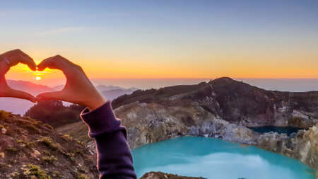 Sun rising in a heart shaped hands over a lake over the Kelimutu volcanic crater lakes in Moni, Flores, Indonesia. Skyline is bursting with orange. Turquoise color of the lake. Golden hour.