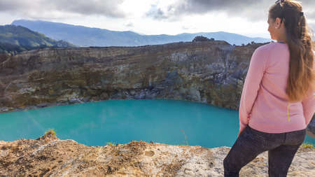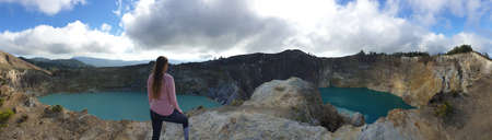 A woman standing at the volcano rim and watching the Kelimutu volcanic crater lakes in Moni, Flores, Indonesia. Woman is relaxed and calm, enjoying the view on turquoise lake. Big overcast.
