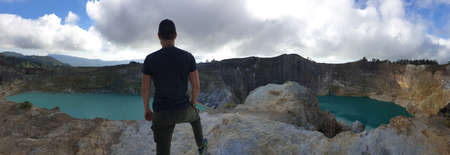 Man standing at the volcano rim and watching the Kelimutu volcanic crater lakes in Moni, Flores, Indonesia. Man is relaxed and calm, enjoying the view on turquoise lakes. Lakes have different colours