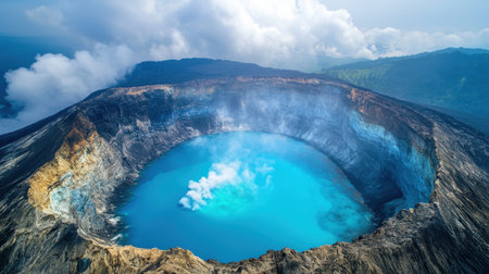 A captivating volcanic crater showcases bright blue water at its center, with steep rocky edges and clouds rolling over surrounding mountains in a peaceful atmosphere.