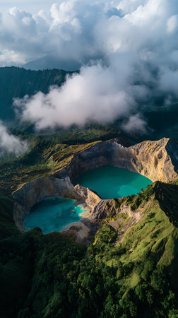 Stunning aerial view showcases Kelimutu's two crater lakes, Flores Island, Indonesia. Turquoise waters contrast sharply with the dramatic volcanic landscape and lush green vegetation.