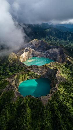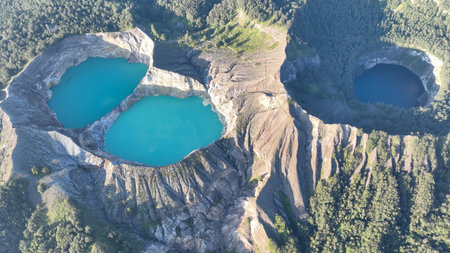 Striking aerial view of the Kelimutu volcano crater lakes on Flores Island, Indonesia. Vivid turquoise water contrasts with the surrounding steep volcanic cliffs and lush jungle.