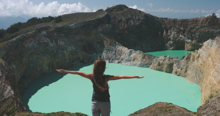 Woman stands at a turquoise crater lake, embracing the stunning view of a volcanic landscape, inviting viewers to explore and discover the serene setting
