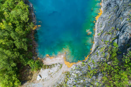 Aerial view of amazing pond in tropical rainforest forest with mountain rocks peak Beautiful water surface in Phang Nga Thailand