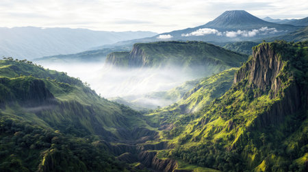 A breathtaking view of Volcanoes National Park in Rwanda, featuring lush green mountains, mist-covered valleys, and a prominent volcano under a cloudy sky, showcasing the serene and dramatic beauty of the African wilderness.