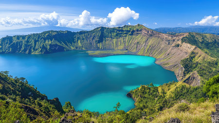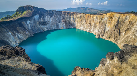 This stunning image showcases a picturesque crater lake, featuring vibrant blue water nestled within towering mountains under a bright sky. The volcanic landscape offers a breathtaking view, perfect for nature enthusiasts and travelers.