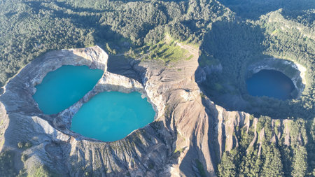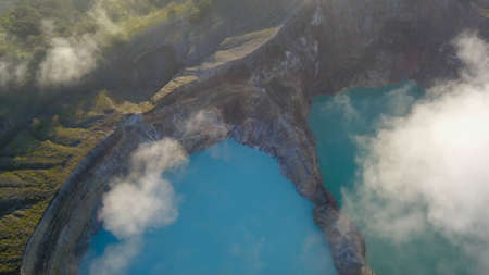 Aerial Drone view of Danau volcano Kelimutu in Ende, Flores island. Sunrise. Colorful crater lake. East Nusa Tenggara Aerial view