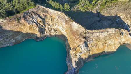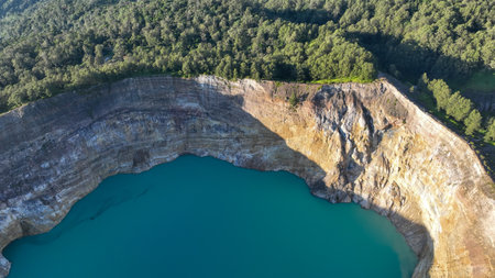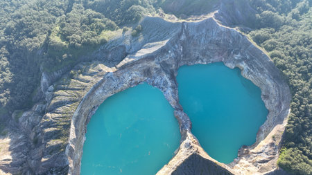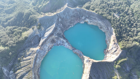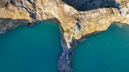 A drone top-down shot of volcano Kelimutus crater lake in Flores, Indonesia. The lake has a very strong turquoise colour thanks to the minerals in the water. Natural phenomenon