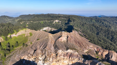 Close up of Kelimutu crater ridge shows dramatic texture and color transitions, blending volcanic earth with lush forest in the morning light
