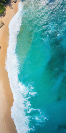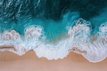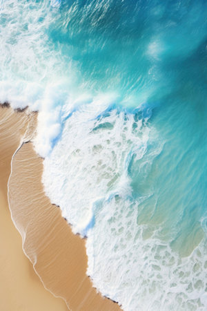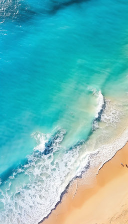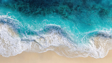 Stunning aerial view of turquoise ocean water with gentle waves crashing onto a sandy beach. A perfect blend of nature's beauty ideal for travel and relaxation imagery.