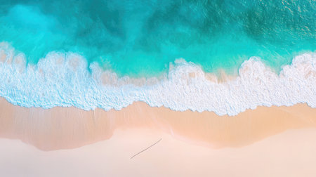 Stunning aerial view of turquoise ocean waves gently crashing against a soft sandy beach. The image captures a serene and tranquil tropical paradise.