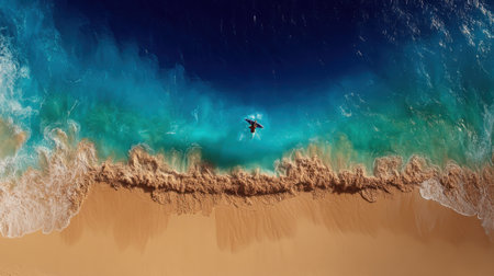 Breathtaking top down aerial view of a solitary person in the vibrant turquoise waves of the ocean as they meet a golden sandy shore. A powerful and beautiful nature scene.