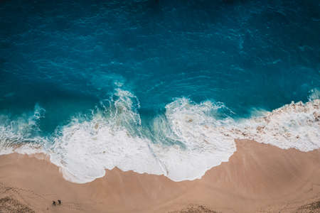 Beach and large ocean waves. Coast as a background from top view. Blue water background from drone. Summer seascape from air. Travel image