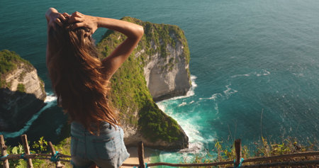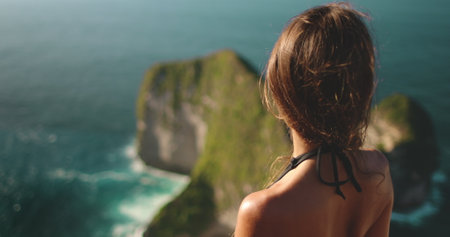 A woman stands on top of a cliff overlooking the vast ocean on Nusa Penida Island in Indonesia. The scene captures her in contemplation as she takes in the breathtaking view below.