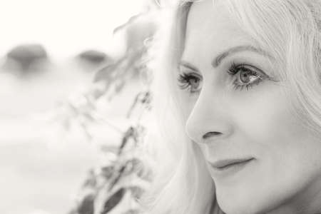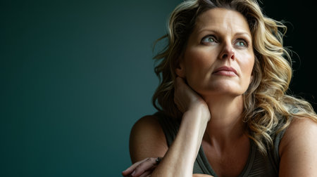 A woman with beautiful long blonde hair is gazing off to the side, her expression contemplative. Her features are highlighted by the soft light falling on her face.