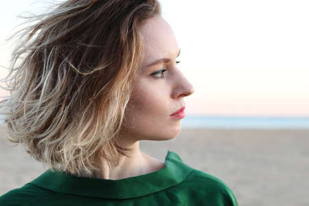 Close up of beautiful young woman face in sunlight. Blonde female enjoying vacations and sunshine.