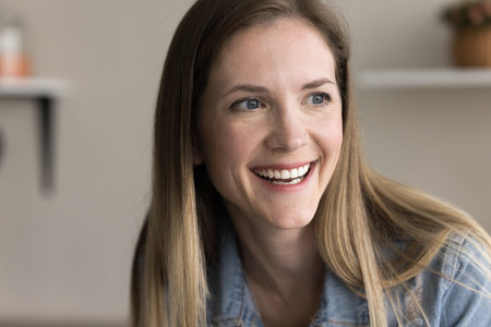 A young, beautiful girl with a snow-white smile and an expressive look of blue eyes. The girl's head is slightly leaned. Around the girl there is a grey background and space for text or graphics.