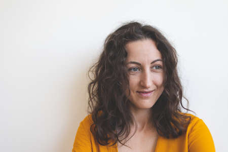 This striking portrait captures a confident young woman with beautiful curly hair, exuding grace and individuality in a soft, minimalistic setting. Perfect for beauty and lifestyle themes.