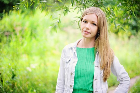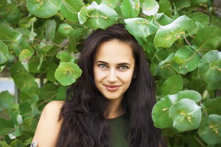 beautiful Smiling pretty Woman on wooden trendy green wall hut background