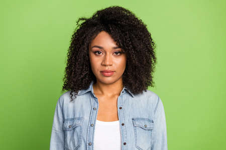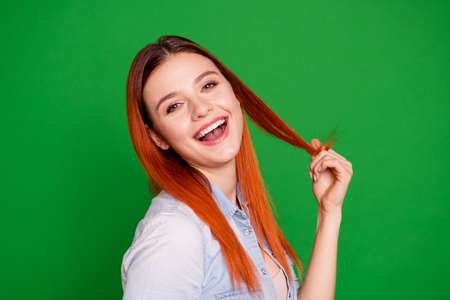 Close up side profile photo beautiful amazing she her foxy lady coquettish playing one curl toothy beaming smile pretty attractive wear casual jeans denim shirt isolated green bright background