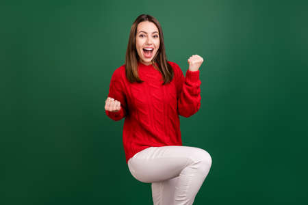 Photo of young cheerful girl happy positive smile celebrate victory fists hands win lottery isolated over green color background