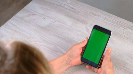 Middle-aged female senora uses an iPhone smartphone with a chroma key screen, copy space, top view. Online shopping concept, use of mobile applications: Moscow, Russia - June 24, 2021.