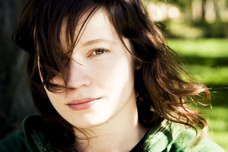brunette girl smiles with the wind in your hair shiny, blacks and long