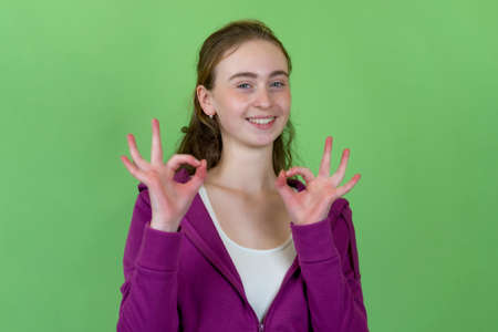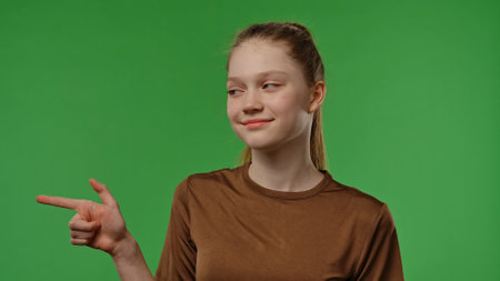 Teenage girl posing at camera smiling and pointing finger at side, positive expression, isolated on chroma key green screen studio background mockup.