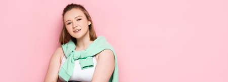 website header of overweight girl with sweatshirt over shoulders smiling at camera on pink