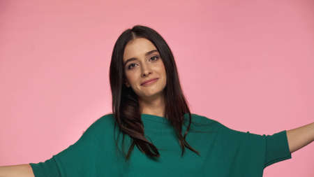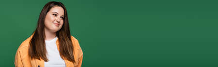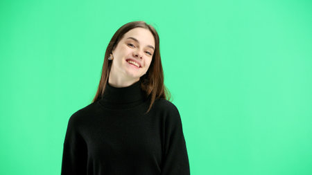 Portrait of a happy, smiling good-looking woman. Closeup headshot of a cheerful, confident young lady with a pretty face and a positive, charming, natural smile against a green studio background