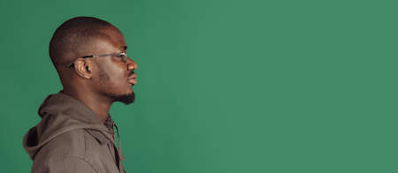 Side view. Close-up portrait of young african man posing isolated on studio background with copyspace for ad. Flyer