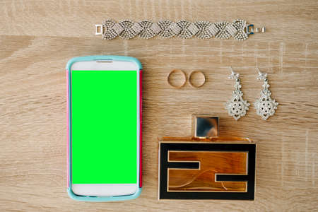 Smartphone with a blank screen lies on a wooden table next to earrings, rings, a bracelet and perfume