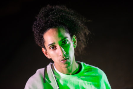 Portrait of good-looking male dancer at night. Handsome African American man with curly hair looking at camera. Portrait, beauty concept