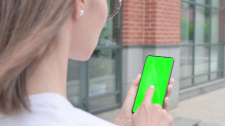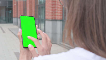 Woman sitting on a sofa with smart phone in horizontal mode . Phone with Greenscreen and Chroma Key. Mock Up with Tracking Markers and Alpha Matte. Caucasian Female Looking at Isolated Colour of Cellp