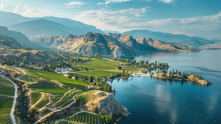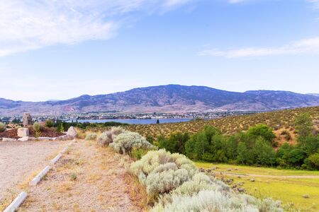Beautiful landscape of Okanagan Valley. Wide shot of agricultural lands and lake in Okanagan Valley, British Columbia, Canada