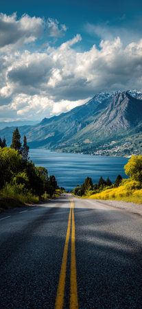 An asphalt road stretches towards a vast lake, flanked by mountains and trees. The scene is dominated by shades of blue and green, with a bright sky filled with fluffy clouds. The image evokes a sense of journey and exploration, suitable for commercial or editorial applications.