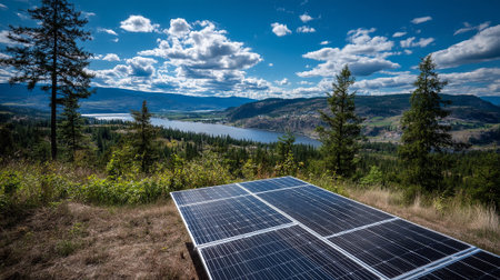 A solar panel array installed on a hillside overlooking a serene lake and mountainous landscape under a blue sky with clouds