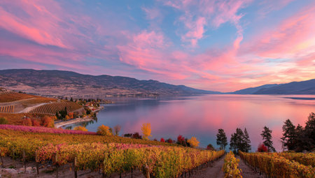 Autumn vineyard and pine trees with view of Okanagan Lake, mountains, and blue sky