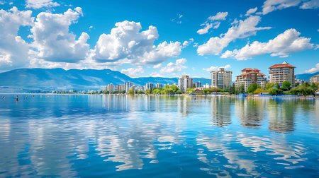 beauty sunny day on the lake wide view with white clouds on the sky.