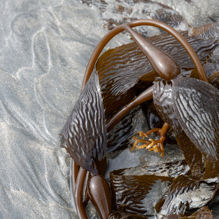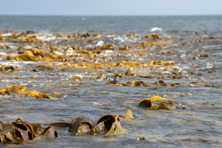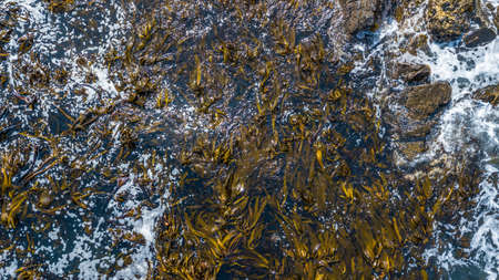Seaweed and bull kelp growing on rocks in the ocean in australia. Waves moving seaweed over rock and flowing with the tide in Japan. Seaweed farm in australia