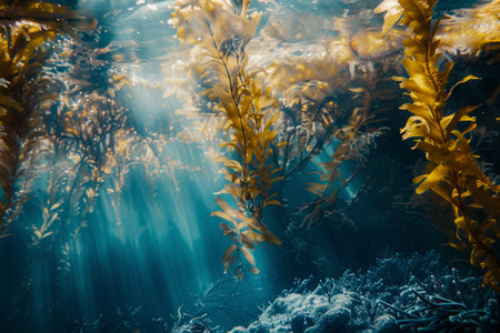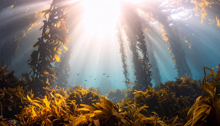 A mesmerizing underwater scene of a giant kelp forest swaying in the ocean current. Sunbeams filter down from the surface, illuminating the golden seaweed and schools of small fish in a thriving marine ecosystem.