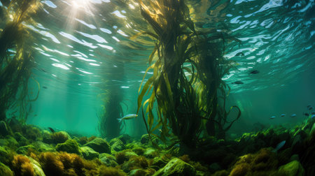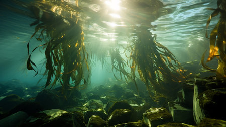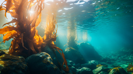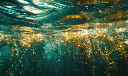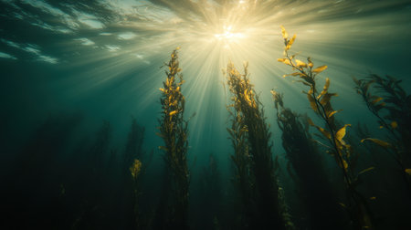 A vibrant underwater scene showcasing a kelp forest, with sunlight creating a beautiful effect.