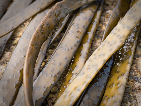 Bull kelp seaweed growing on rocks. Edible sea weed ready to harvest in the ocean