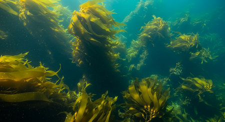 Underwater View of Sunlit Kelp Forest in Pristine Ocean.